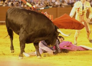 Cándido Ruiz, que pudo continuar la lidia, cayó en la cara del quinto toro en unos angustiosos instantes, sufriendo un varetazo en la rodilla izquierda