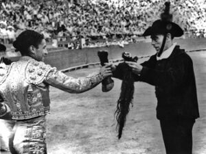 En esta foto podemos observar el testimonio de otra forma de ver y valorar el toreo, el alguacil entrega orejas, rabo y pata a César Girón. ¿Un modelo mejor, peor?... digamos que distinto. MÁS FOTOS CON HISTORIA - Lujo Puro - Plato fuerte - Cita universal - Marcial en Valencia - Arte en los tendidos