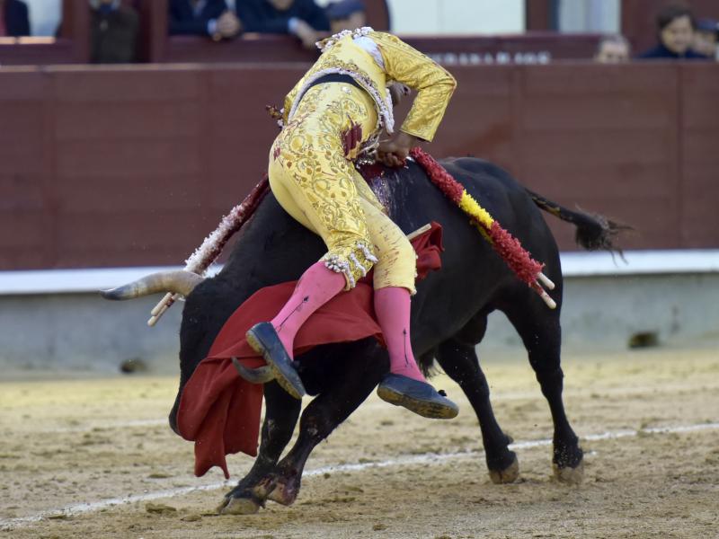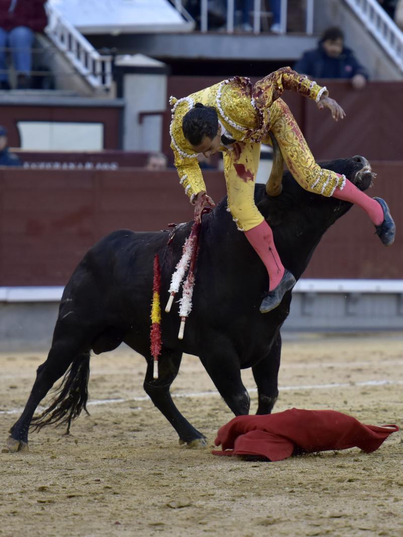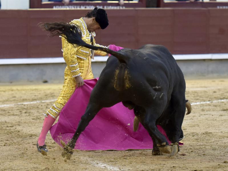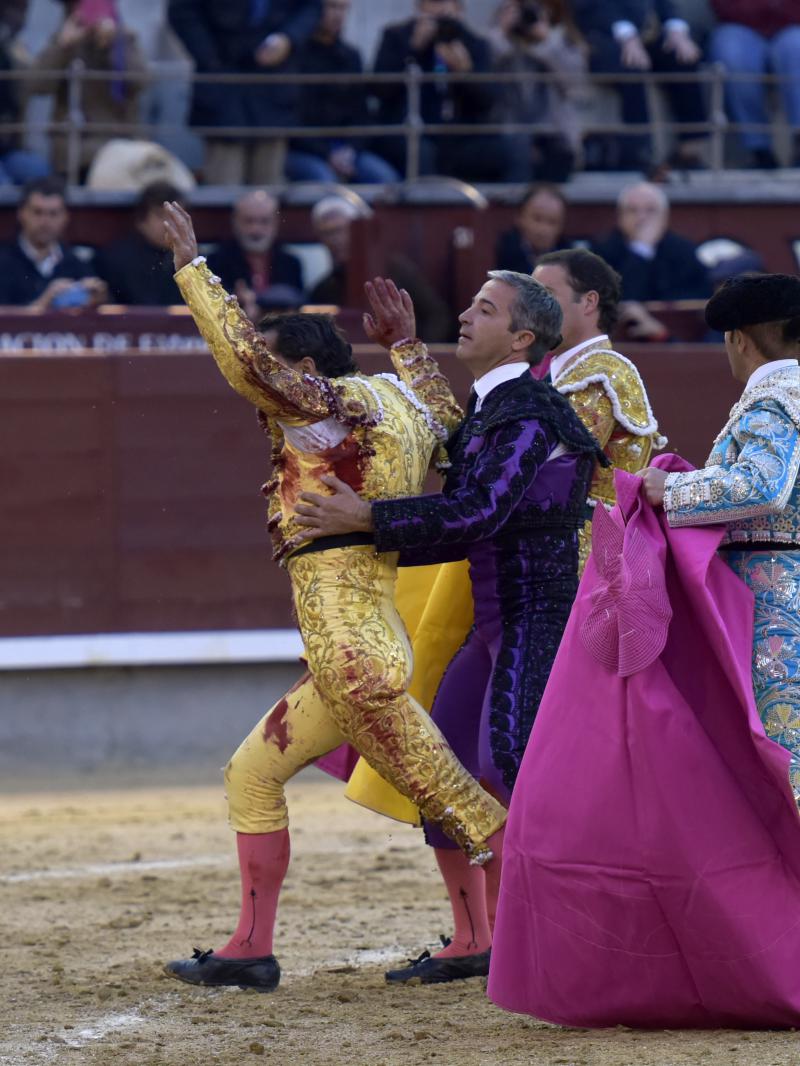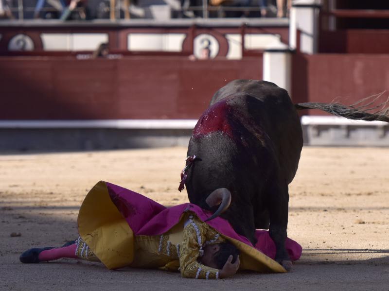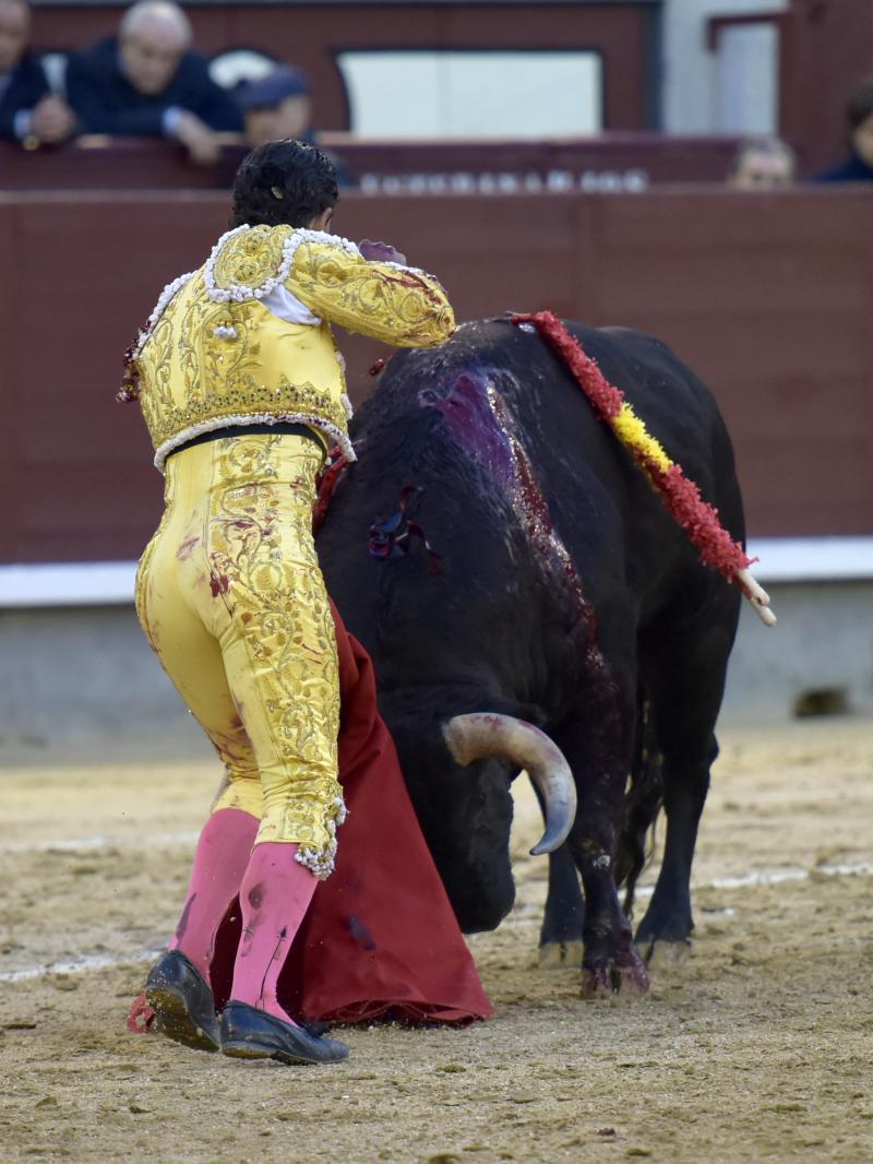El sexto fue devuelto a los corrales tras blandear en el primer tercio. En su lugar saltó un sobrero de José Luis Pereda justo de fuerza y manejable. Fandiño tiró de corazón y de raza, queriendo mucho. Dio dos tandas buenas por el pitón derecho. Bajó algo sobre el izquierdo, pero el trasteo remontó de nuevo el vuelo en un final por bernadinas. Heroica fue su manera de entrar a matar, encunándose sobre los pitones, dejando un espadazo contrario y siendo volteado aparatosamente. El toro tardó en caer y Fandiño, con la cara ensangrentada y el vestido roto, vio cómo le pidieron la oreja. El presidente no accedió y todo quedó en una fuerte ovación con saludos.