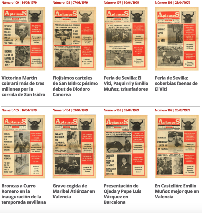 Aplausos sigue incluyendo ejemplares en la hemeroteca digital. Los usuarios de Aplausos Premium ya pueden disfrutar de todas las revistas publicadas en el año 1979. Una temporada apasionante que tuvo noticias luctuosas como la muerte de Felipe de Pablo Romero, las irrupciones de Emilio Muloz y Pepe Luis Vázquez, los triunfos de El Viti en la Maestranza de Sevilla, el debut empresarial de Diodoro Canorea en Las Ventas... Le invitamos a hacer un viaje al pasado pinchando aquí.