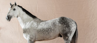 Edad: 4 años. Hierro: Santos Mortes. Raza: Lusitano. Pelo: Tordo. Tercio: salida.