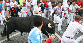 Los seis toros negros de la ganadería madrileña han corrido en todo momento agrupados junto a los cabestros y salvo un derrote en la cuesta de Santo Domingo, apenas han causado momentos de peligro para los corredores.