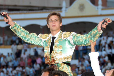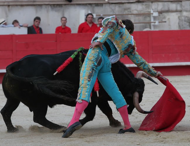 19/09/2008.- Nimes (Francia). Lleno. De turquesa y oro. Toros de Daniel Ruiz, el sexto, de nombre Mamarracho, número 58, de 510 kilos, premiado con la vuelta al ruedo. Oreja, dos orejas, palmas, dos orejas tras aviso, ovación con saludos y dos orejas y rabo.