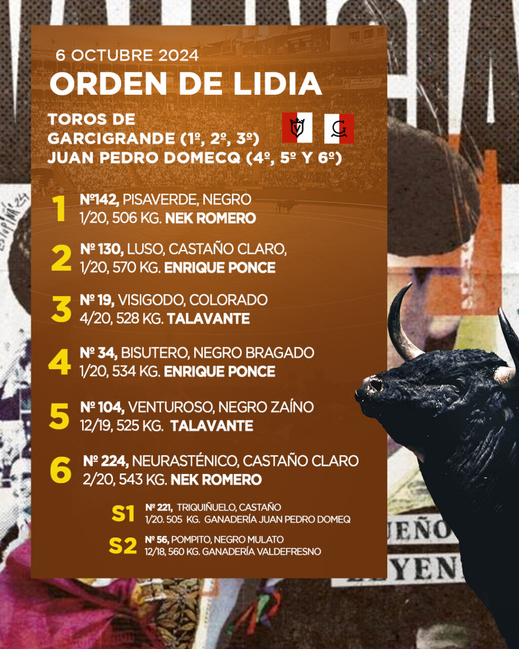 🔜 Todo preparado en 𝗩𝗔𝗟𝗘𝗡𝗖𝗜𝗔 para la despedida de 𝗣𝗢𝗡𝗖𝗘 junto a la alternativa de 𝗡𝗘𝗞 𝗥𝗢𝗠𝗘𝗥𝗢, y 𝗧𝗔𝗟𝗔𝗩𝗔𝗡𝗧𝗘. Se lidiarán los de Juan Pedro y Garcigrande (18:00h.) pic.twitter.com/CsYH3kMdrl