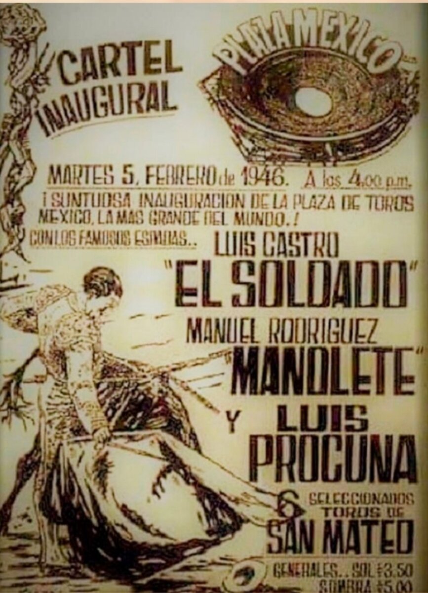 Alrededor de cincuenta mil espectadores llenaron la Plaza Monumental México, la más grande del mundo, el día de su inauguración. Se lidiaron seis toros de la ganadería mexicana de San Mateo, propiedad de Antonio Llaguno, que resultaron bravos en general. Luis Castro “El Soldado”, que vestía de marfil y plata (pitos y pitos), Manolete, con un terno tabaco y oro (oreja y dos vueltas al ruedo) y Luis Procuna, de azul y oro (oreja y ovación). Jardinero, cárdeno oscuro caribello, marcado con el núnero 33, fue el primer toro lidiado en este coso.
