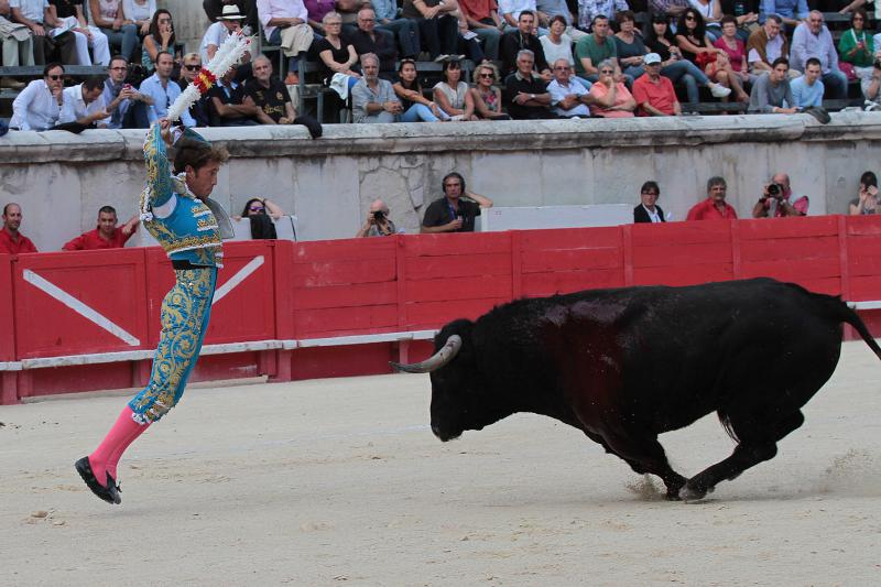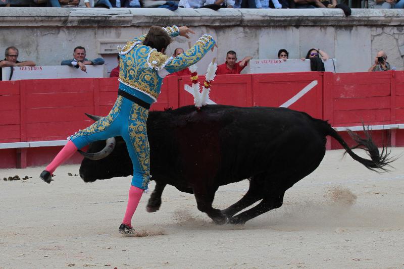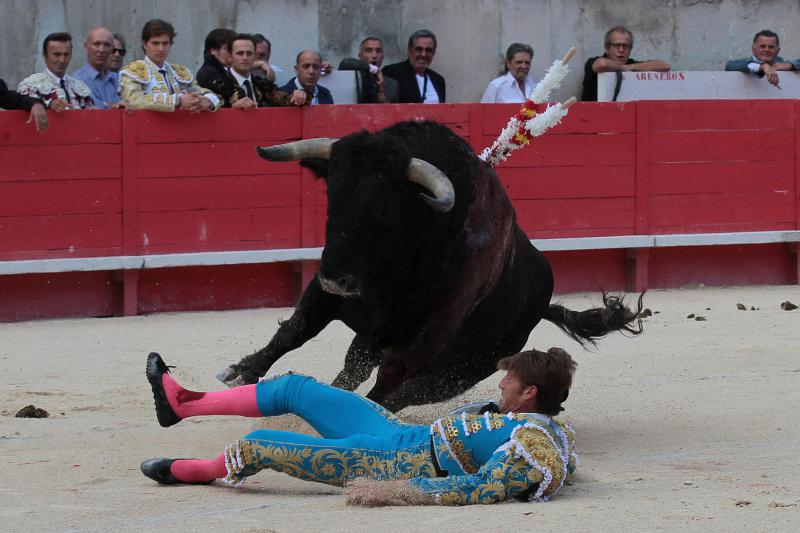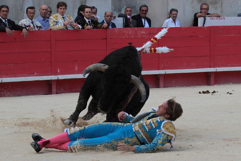 Manuel Escribano fue cogido por su primer toro de El Torero en Nimes, recibiendo una cornada de 7 cm. en el gemelo de la pierna derecha. El torero continuó la lidia y fue tras pasaportar al toro cuando pasó a la enfermería, donde fue operado de una cornada limpia que no afectaba a vasos importantes. Antes, ya había sido cogido sin consecuencias en su primer par de banderillas.