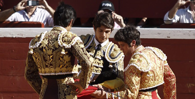 No tuvo opciones Castella con el sobrero que hizo segundo, que apenas duró un par de tandas. El francés lo recibió con buen estilo y el principio de faena sentado en el estribo fue un espejismo. Se atascó la espada y fue silenciado. Con el cuarto, Sebastián Castella cobró una monumental paliza tras perder pie en los pases cambiados por la espalda del comienzo de faena. Por fortuna no hubo que lamentar consecuencias y el torero galo se repuso para dar fiesta a un toro que no fue fácil con el que acabó metido literalmente entre los pitones. Cortó una oreja.