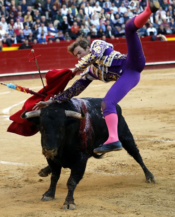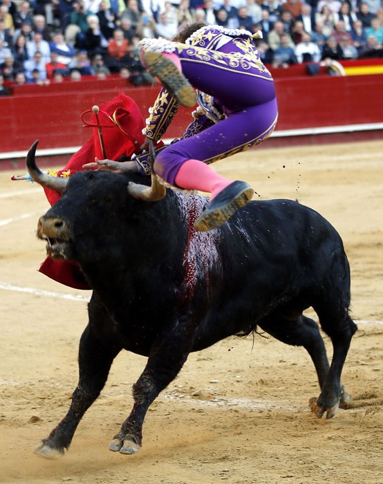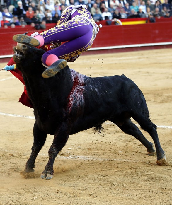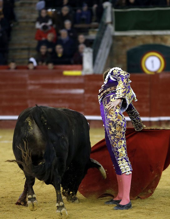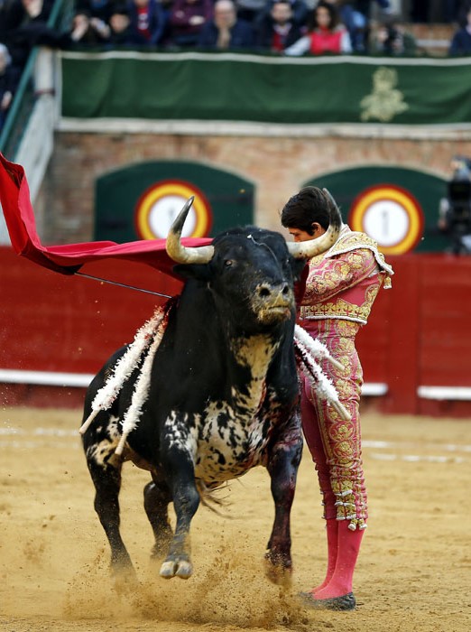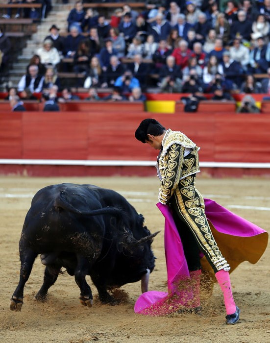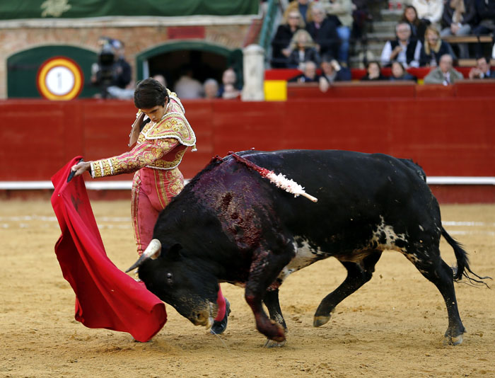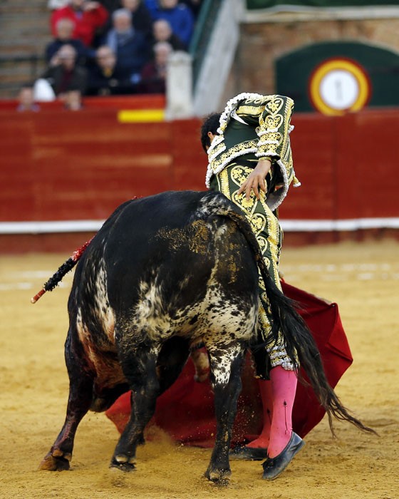 Salió con brío el tercero, que se dio un chocazo que rompió parte de las tablas. El valenciano Román, centrado y puesto, se lució en un quite por tafalleras ligadas a una gaonera en el toro de Perera. Con el cuchillo entre los dientes, echó las rodillas en tierra en la apertura de faena: tres derechazos rotundos antes de ligar un cambio de mano y de que el toro le levantase los pies del suelo. Le dibujó la cornada en la ingle el toro y se escapó de milagro. Encogidos los corazones, ni se miró Román. La faena, en los medios hasta que el toro se rajó, estuvo presidida por el valor, la entrega, la ambición y el corazón de Román ante un toro exigente y áspero. Hubo emoción en la plaza, por la verdad y la determinación del valenciano, y la encastada y mansa condición del toro. La estocada entera y caída le entregó en la mano la oreja.