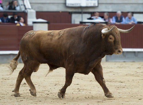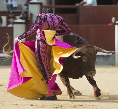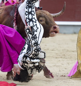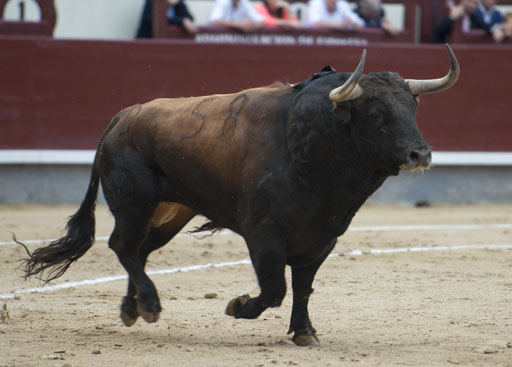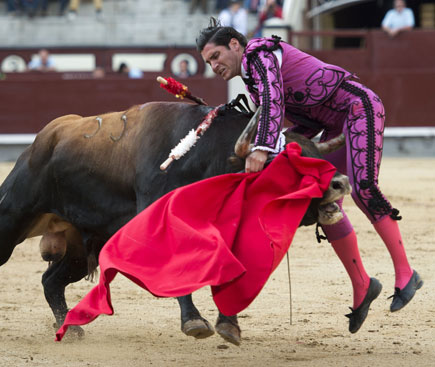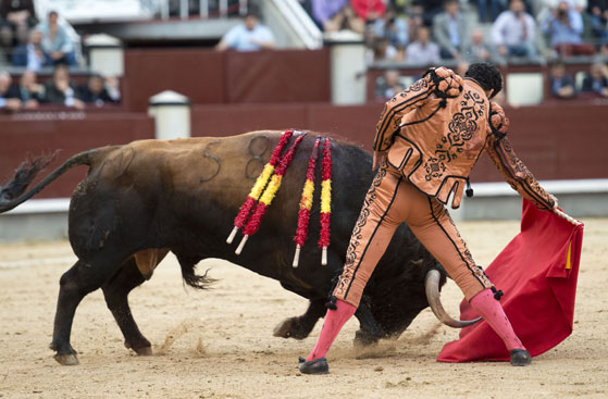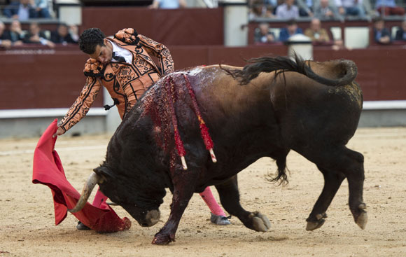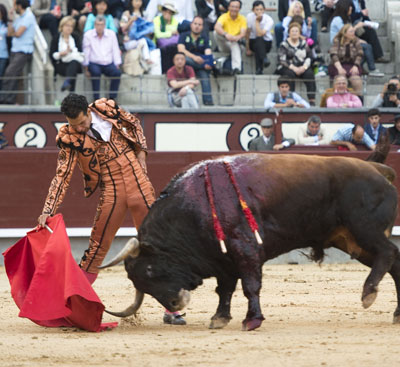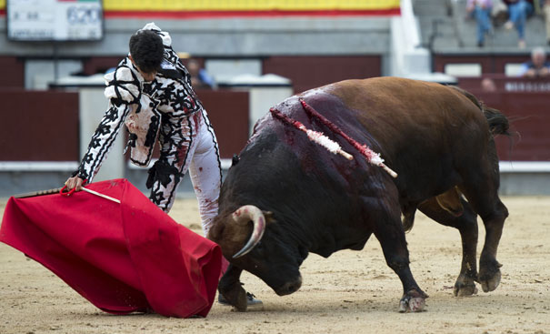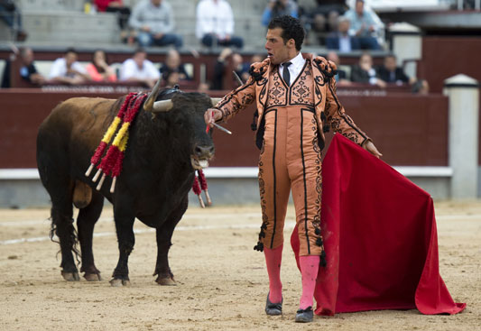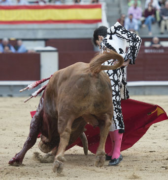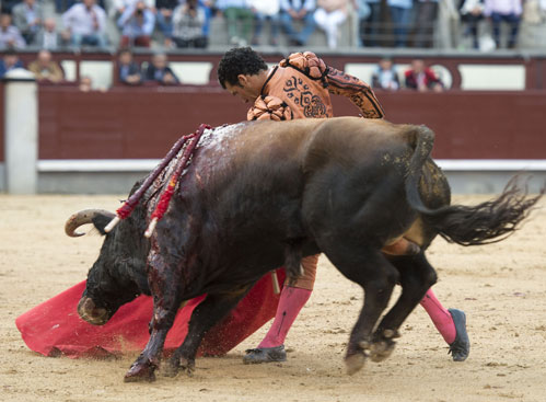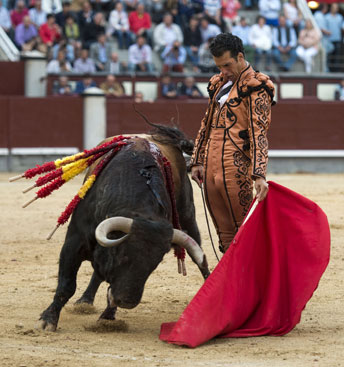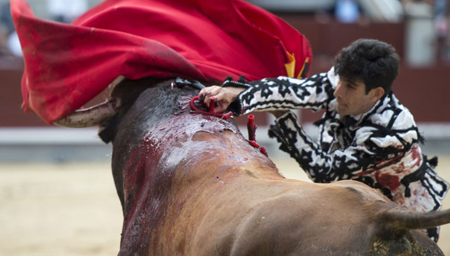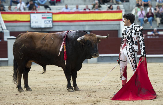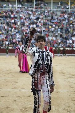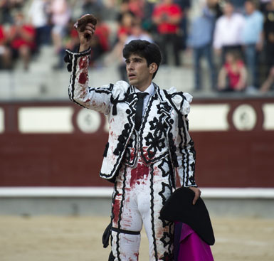 Alberto López Simón fue herido por el tercero, frente al que llevó a cabo un gesto muy de hombre dándole muerte y cortándole una oreja de ley con el muslo ensangrentado. El percance llegó al entrar a matar: tras un primer pinchazo, entró de nuevo, siendo derribado y herido en el muslo derecho. El toro fue un astado noble y manejable, con más clase que los dos primeros. Tras un buen inicio de faena por bajo, López Simón protagonizó sobre la base de la entrega y la firmeza una faena de enorme determinación, templanza y reunión. No fue una labor redonda -en ocasiones la tendencia del animal a puntear provocaba cierto desajuste en el final de las tandas-, pero todo quedó compensado por la decisión. Tras la estocada, cobrada con una desgarradora entrega, descabelló en un par de ocasiones y pidió que saliera su siguiente toro. Gesto de torero macho.