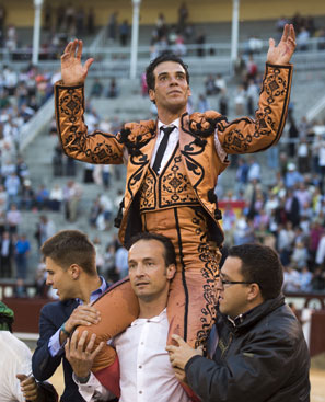 El burgalés cuaja una profunda faena al quinto y sale a hombros tras cortarle las dos orejas, mientras que el madrileño, que pasea un trofeo de cada ejemplar de su lote, da una gran dimensión y cae herido grave haciendo un esfuerzo desgarrador