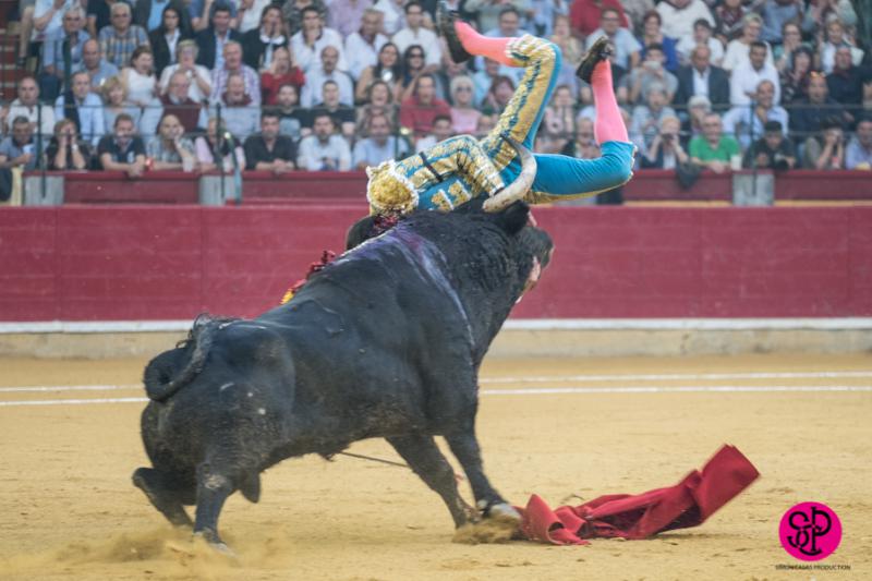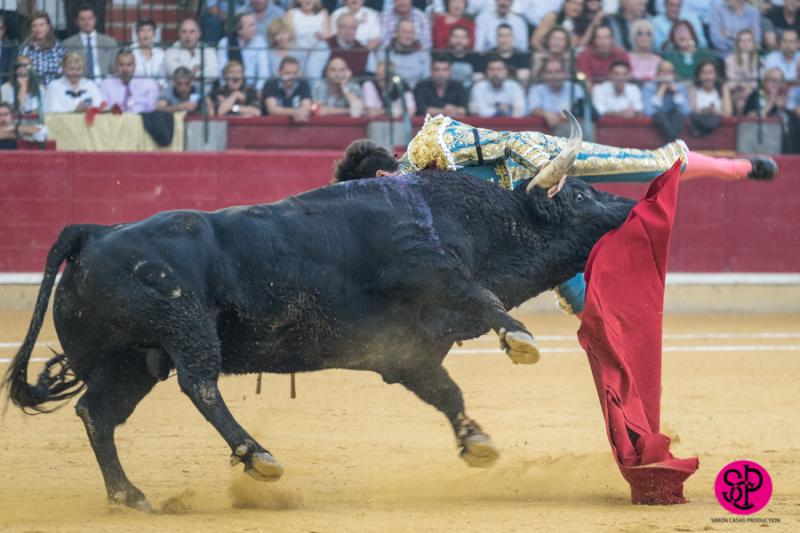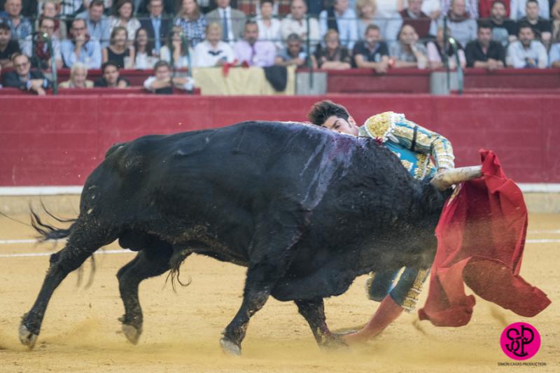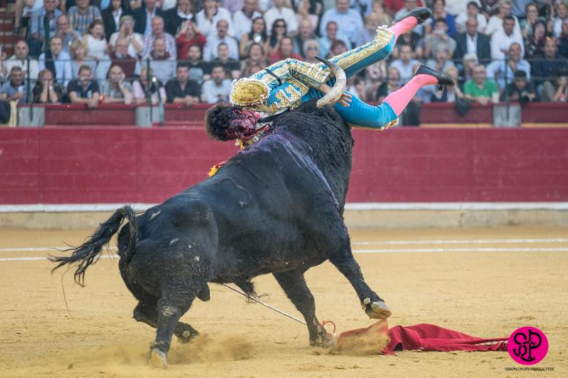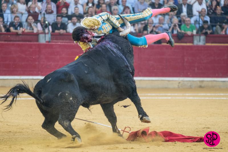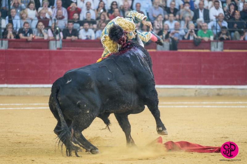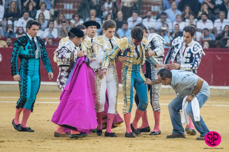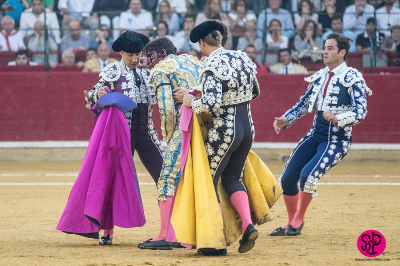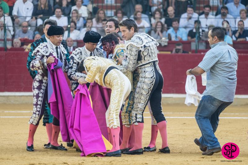 El diestro -trasladado a la Clínica Quirón de Zaragoza- fue prendido cuando citaba para torear al natural, sufriendo un seco derrote en el muslo, llegando a girar sobre los pitones. Salió del trance con la cara ensangrentada y una herida visible en la cara interna de la pierna, de la que sangraba profusamente. A pesar de ello, quiso seguir la lidia, dio una serie más sobre la mano derecha y dio muerte al toro de una estocada. La gesta fue recompensada por el palco presidencial con las dos orejas.