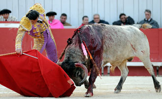 Más basto de hechuras fue el que hizo segundo que salió reservón, midiendo y quedándose muy corto. Resultó un imposible. Desde salida mostró su peligro y llegó orientado y desarrollando sentido al último tercio donde se encontró a un firme y valiente David Mora que resultó prendido de forma muy espectacular al rematar un pase de pecho sobre el pitón izquierdo, sufriendo dos varetazos. El madrileño realizó una más que interesante faena al quinto. El madrileño ofreció en el anfiteatro francés su mejor versión. Le ayudó más este cebada que su anterior y lo toreó fenomenal Mora. Muy de verdad el torero, asentado, firme, gustándose y toreando templado, con profundidad y hondura, especialmente sobre la diestra. Muy despacio. Cadencia, ligazón y ritmo. Sobre la izquierda la faena y la condición del animal bajó. Mató de una estocada entera y un punto tendida y paseó un trofeo.