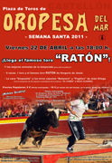 El famoso toro Ratón se despedirá de la provincia de Castellón el próximo 22 de abril en Oropesa, coincidiendo con las fiestas de Semana Santa, durante la única actuación prevista en tierras castellonenses en la presente temporada. La estrella de la ganadería Gregorio de Jesús inició en Paiporta una tourné en la que, como los grandes, irá diciendo adiós a la afición que tantas tardes ha seguido esta leyenda vida. Así, el festivo viernes 22, a partir de las 18.00 horas, Ratón saldrá al ruedo acompañado de dos experimentados recortadores como son "Cabra" e Isaac Álvarez que contribuirán a resaltar la exhibición del animal. Asimismo, la exhibición del toro estará precedida por la suelta de cinco vacas y un toro del ganadero de Sueca y culminará con la vaca Duquesita y los toros Butanero y Fugitivo de José Ortega, de Alfap. Las entradas anticipadas del evento, organizado por la firma Arte y Emoción, con Javi González "Viza" al frente, tendrán un precio de 9 euros y podrán adquirirse de forma anticipada en las Amas de Casa de Oropesa "Orobexa" (Calle Virgen de la Paciencia, nº 37 – 1º o llamar al 686 501 751). Asimismo también pueden reservarse por teléfono a través del 692 649 165. Cabe señalar que los niños menores de seis años entrarán gratis si van acompañados de un adulto.