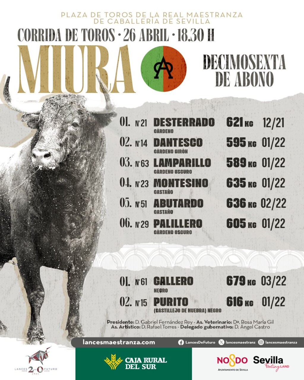 De Desterrado a Palillero, esos son los seis toros de Miura que cierran este domingo la Feria de Abril de Sevilla. Manuel Escribano, Pepe Moral y Román se enfrentan a partir de las 18:30 horas a los toros del hierro de la A con asas. Dos toros castaños y cuatro cárdenos conforman un encierro que oscila entre los 589 kilos del tercero y los 636 del quinto. El orden de lidia y las cuadrillas son las siguientes: