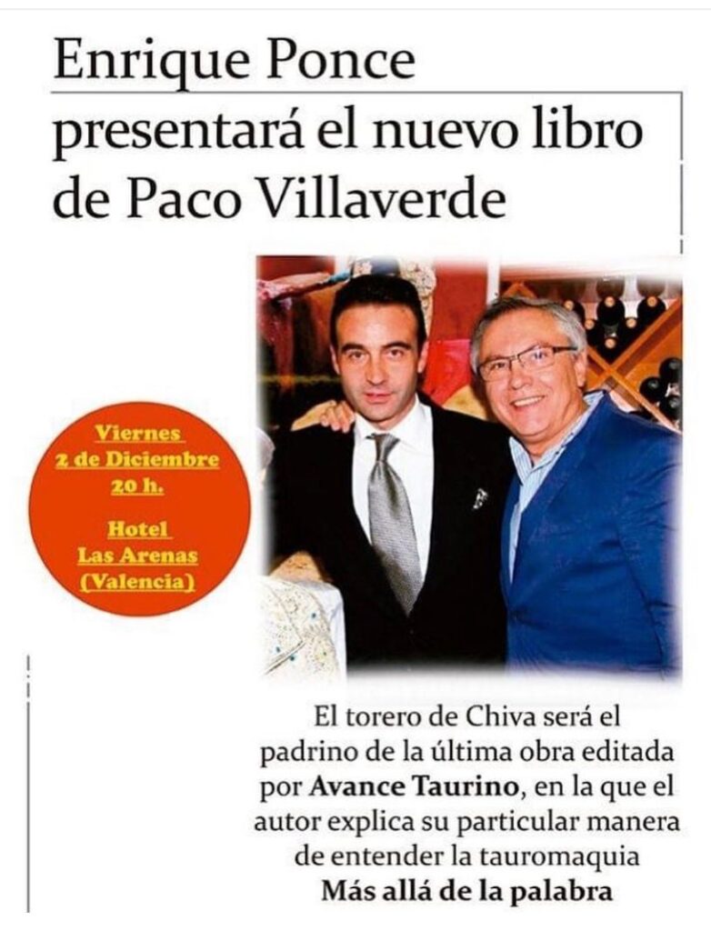 Paco Villaverde presentará en Valencia (Hotel Las Arenas, 2 de diciembre a las 20 horas) su último libro, “Más allá de la palabra”, en el que explica, asegura en su invitación, su particular manera de entender la tauromaquia. El acto contará con la presencia del maestro Enrique Ponce que ejercerá como padrino en la que supone su primera presencia pública en Valencia desde que se retiró de los ruedos.