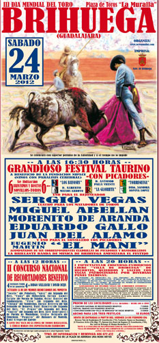 La localidad alcarreña de Brihuega ha presentado la programación del III Día Mundial del Toro que se llevará a cabo en esta localidad el próximo 24 de marzo. En el acto de presentación estuvieron presentes el teniente Alcalde de Brihuega, Abelardo Mazo, Borja Blanco, director del portal taurino organizador del evento www.ToroMundial.com y Ramón Rebollo, Presidente de la Fundación Nipace, fundación para la cual van todos los beneficios del III Día Mundial del Toro del Toro.
