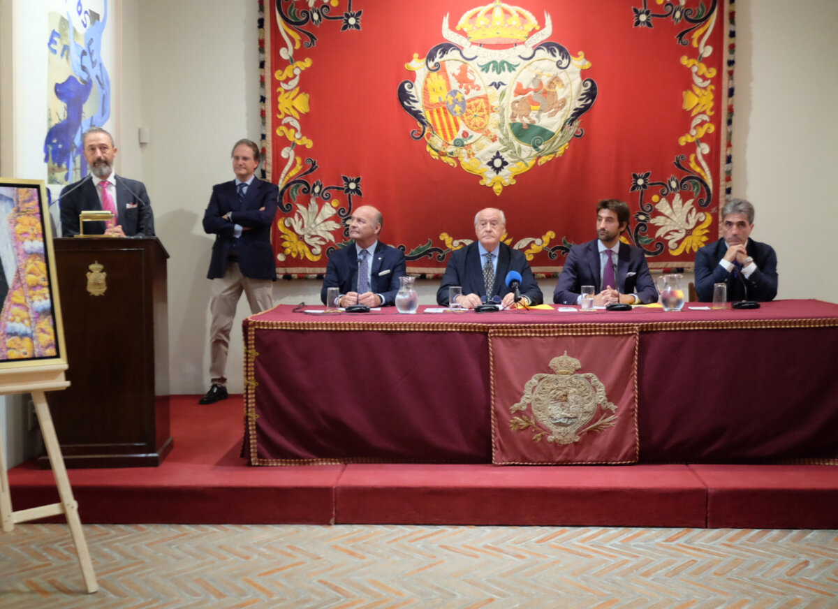 El Salón de Carteles de la Real Maestranza acogió la presentación del cartel del festival taurino benéfico que se celebrará en la plaza sevillana el día 12 de octubre. En la tribuna ocuparon un lugar el gerente de la Empresa Pagés, Ramón Valencia; el consejero Ramón Valencia Canorea; el Hermano Mayor del Gran Poder, Ignacio Soro, y el diestro Emilio Muñoz, organizador del festejo. Entre los presentes se encontraban los matadores de toros Juan Ortega y Pablo Aguado, así como el novillero Diego Bastos.