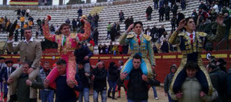 Jesús Duque, Borja Álvarez y Vicente Soler han salido a hombros junto al mayoral de la ganadería de Daniel Ramos al término del festejo matinal que se ha celebrado este domingo en la plaza de toros de Requena. La excelente novillada del hierro valenciano -que hoy lidiaba su primera novillada con picadores- contó con un utrero de vuelta al ruedo: el sexto.