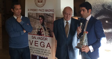 La Unión Taurina de Abonados de Málaga ha hecho entrega al matador de toros Salvador Vega de su XI Premio Paco Madrid a la Mejor Estocada de la pasada Feria de Málaga 2015.