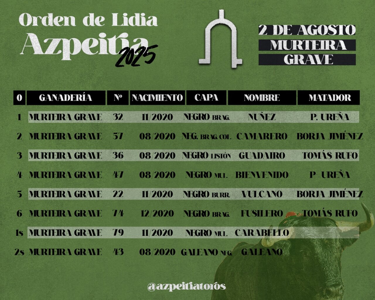 Seis toros de Murteira Grave han sido sorteados en los corrales de la Bombonera para la corrida que esta tarde lidiarán Paco Ureña, Borja Jiménez y Tomás Rufo, que sustituye a Emilio de Justo, en la Feria de San Ignacio de Azpeitia. El orden de lidia es este: