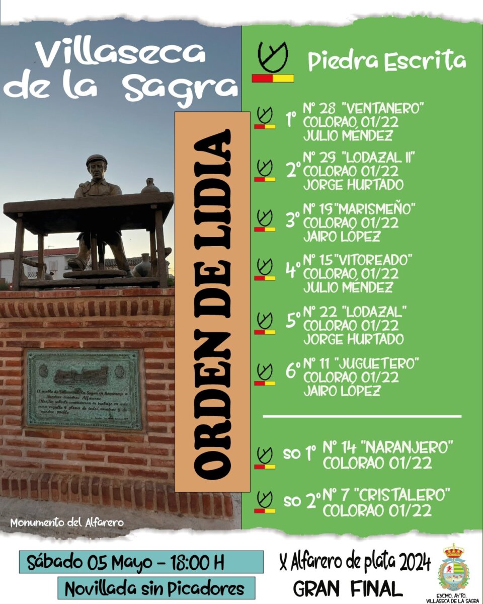 Ya aguardan en los toriles de Villaseca de la Sagra los seis erales de Piedra Escrita para la gran final del Alfarero de Plata. Serán lidiados por Julio Méndez, Jorge Hurtado y Jairo López. Este es el orden de lidia: