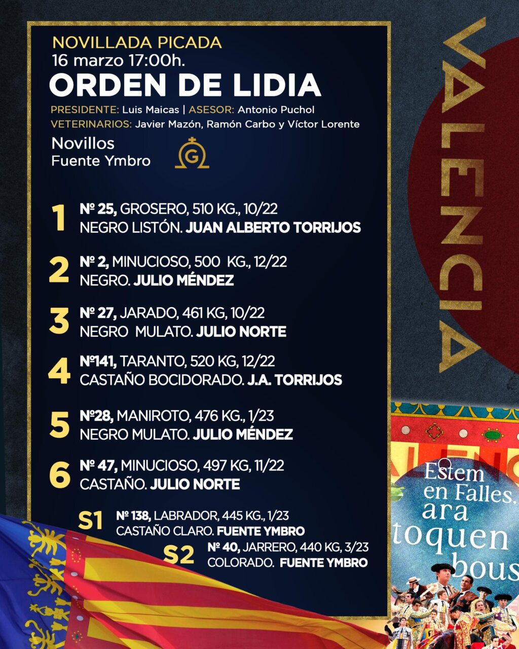 Seis novillos de Fuente Ymbro se van a lidiar esta tarde en la plaza de toros de Valencia. A las 17:00 horas harán el paseíllo Juan Alberto Torrijos, Julio Méndez y Julio Norte en la última de las tres novilladas programadas en el abono fallero. Este es el orden de lidia: