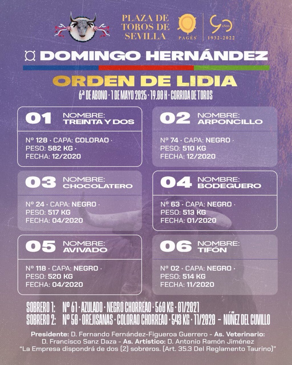 Seis toros de Domingo Hernández esperan ya en los corrales de Sevilla para el cartelazo de arte de esta tarde de la cuarta corrida de la Feria de Abril. Morante de la Puebla, Juan Ortega y Pablo Aguado harán el paseíllo en este esperado festejo. El orden de lidia es este:
