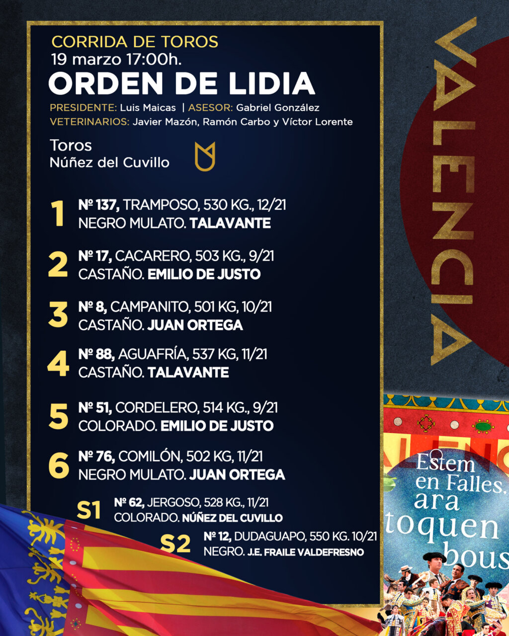 Los toros de Núñez del Cuvillo que van a poner esta tarde el broche al abono de la Feria Taurina de Fallas ya han sido sorteados y enchiquerados. A las 17h. los lidiarán Alejandro Talavante, Emilio de Justo y Juan Ortega. El orden de lidia es el que sigue: