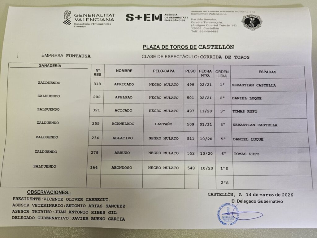 Seis toros de Zalduendo han sido sorteados en la plaza de Castellón para la corrida que lidiarán esta tarde Castella, Daniel Luque y Tomás Rufo, que sustituye a Emilio de Justo. El orden de lidia es este:
