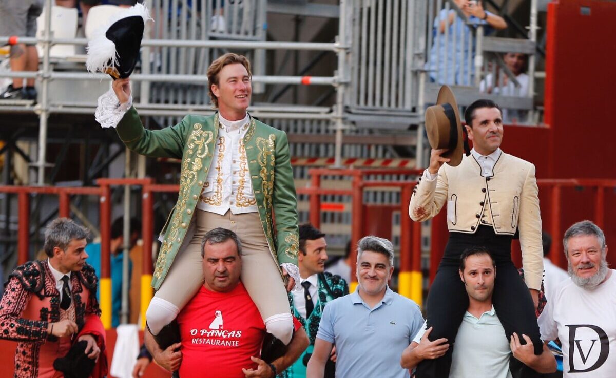 Rui Fernandes y Diego Ventura, que cortó cuatro orejas, a hombros en Arganda del Rey. Foto: Arjona