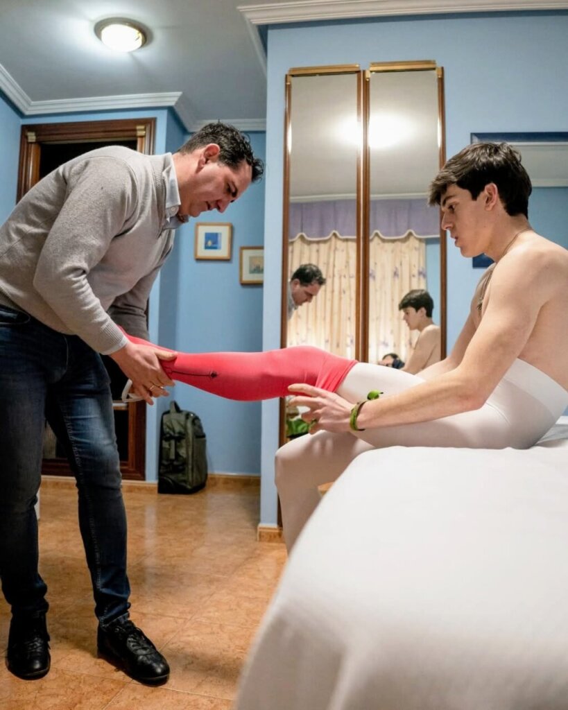 Sobre el río que traza en su piel la cicatriz, Roberto clava tres agujas con una precisión casi quirúrgica. A ellas se conecta un leve pulso eléctrico que despierta el nervio. El músculo responde con pequeñas sacudidas; Sergio aprieta la mandíbula, pero no se queja. “Cuando me tratan la cicatriz es lo que más me gusta”, comenta. “Duele, pero es agradable”. Mientras, hablan de cualquier cosa. De la tarde de Nochebuena, de la dulzura del vermú; la normalidad como refugio. La sesión continúa con láseres, luz roja concentrada sobre la herida para acelerar la regeneración de tejido, ejercicios de fuerza… No hay atajos, sólo repetición y, como bien afirma Rollón, “paciencia, mucha paciencia. Tengo mucha presión por llegar, pero me apetece volver a torear”.