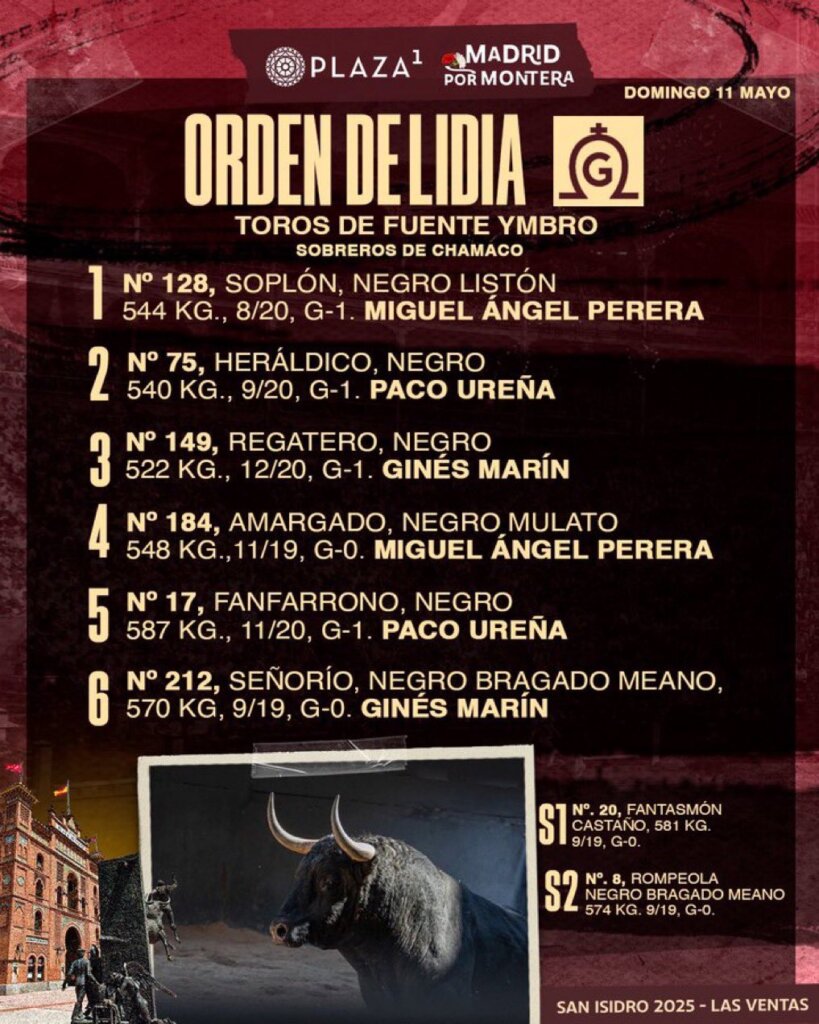 Seis toros de Fuente Ymbro han sido sorteados en los corrales de Las Ventas para la segunda de la Feria de San Isidro. Miguel Ángel Perera, Paco Ureña y Ginés Marín harán el paseíllo. El orden de lidia es este: