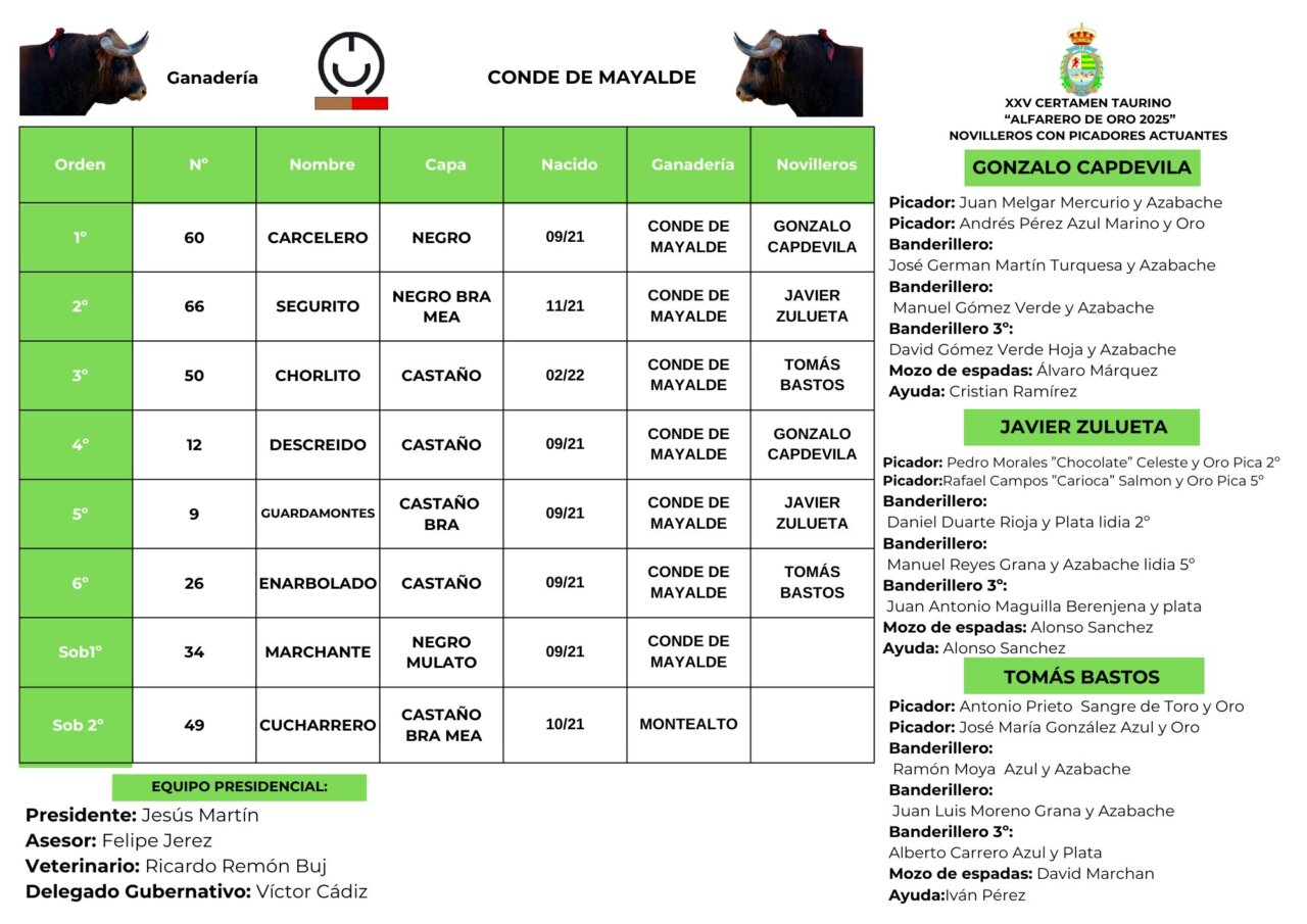 Seis novillos de Conde de Mayalde aguardan en los chiqueros de la plaza de toros de Villaseca de la Sagra para ser lidiados esta tarde por una terna compuesta por Gonzalo Capdevila, que sustituye a Martín Morilla, Javier Zulueta y Tomás Bastos. El encierro se compone de dos utreros negros y cuatro castaños. El festejo comienza a las 18:30 horas y el orden de lidia, cuadrillas y autoridad es el siguiente: