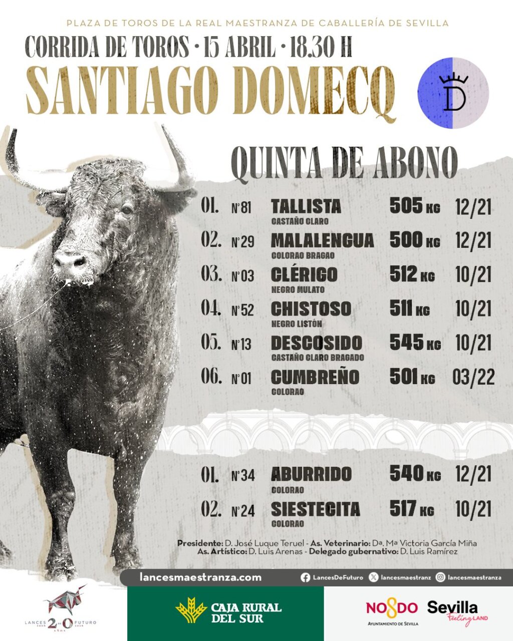 Sorteados los toros de Santiago Domecq par esta tarde en Sevilla