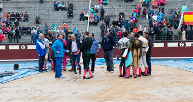 El quinto festejo de la Feria de San Isidro en Madrid ha sido suspendido a causa de la lluvia. A pesar de la lona protectora que cubría el ruedo, el piso plaza estaba impracticable a la hora de inicio de la función. Toreros y autoridad, teniendo en cuenta el alto riesgo que suponía ir adelante con el espectáculo para quienes iban a torear, así como las incomodidades que iba a sufrir el público -la amenaza de lluvia era constante para el resto de la tarde-, abogaron de forma conjunta por la cancelación del festejo.