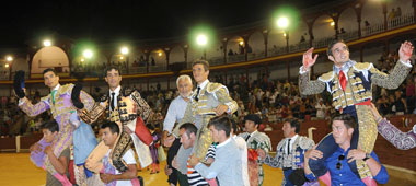 La primera de las tres corridas monstruo de la Feria de Ciudad Real ha resultado un espectáculo triunfal, ya que tanto los tres toreos actuantes como el ganadero de Los Chospes abandonaron el coso manchego a hombros. La ficha del festejo es la siguiente:
