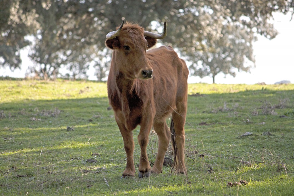 En uno de los cercados que dan al pantano de Pedrezuela, tres kilómetros de linde con los predios de Zacarías, nos topamos con una vaca recién parida con su rastra de apenas unas horas. Es colorada, fina de cabos, bien armada aunque sin gran aparato, solo el necesario, que no es poco, debe de ser cuatreña… el becerro encamado a sus pies, en realidad pegado al suelo, no se mueve, ni cantearse ante nuestra presencia. La vaca nos da la cara, es evidente que nos considera unos intrusos y no le ha gustado la visita. No nos quita ojo durante unos instantes, inmóvil, amenazante, es como si pensase la defensa más adecuada. Arrancarse o largarse… opta por la más inteligente y se va del lugar dejando el becerro. Se va pero no lo abandona, al contrario, solo piensa defender a la cría y para ello ha decidido que no hay mejor estrategia que distraer la atención de nosotros y disimular el lugar donde está el becerrito. Juan, que hoy ejerce de fotógrafo, aprovecha para fotografiarle antes de que la vaca cambie de planes.