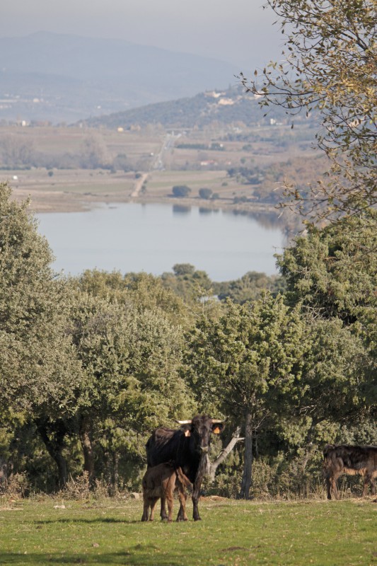 La Dehesa del Quejigal, desde ahora Las Tinadas, hace dos décadas que está en manos de Zacarías, que le ha añadido La Rebollera con la que junta seiscientas hectáreas bajo la misma linde, dimensiones nada frecuentes en la zona donde las propiedades están más repartidas. Aquí pastan las vacas y se cuajan los machos y aunque las instalaciones, incluida la plaza de tientas que utilizaban los Hernández Pla, se mantienen en buenas condiciones, las becerras de tienta las lleva a El Beato, en Chinchón, donde tiene una plaza como para echar una corrida de toros. Finca esta, situada en la vega del Tajuña, muy próxima al río, con excelentes praderas y plantaciones de olivos donde todo parece más afable, menos rústico.