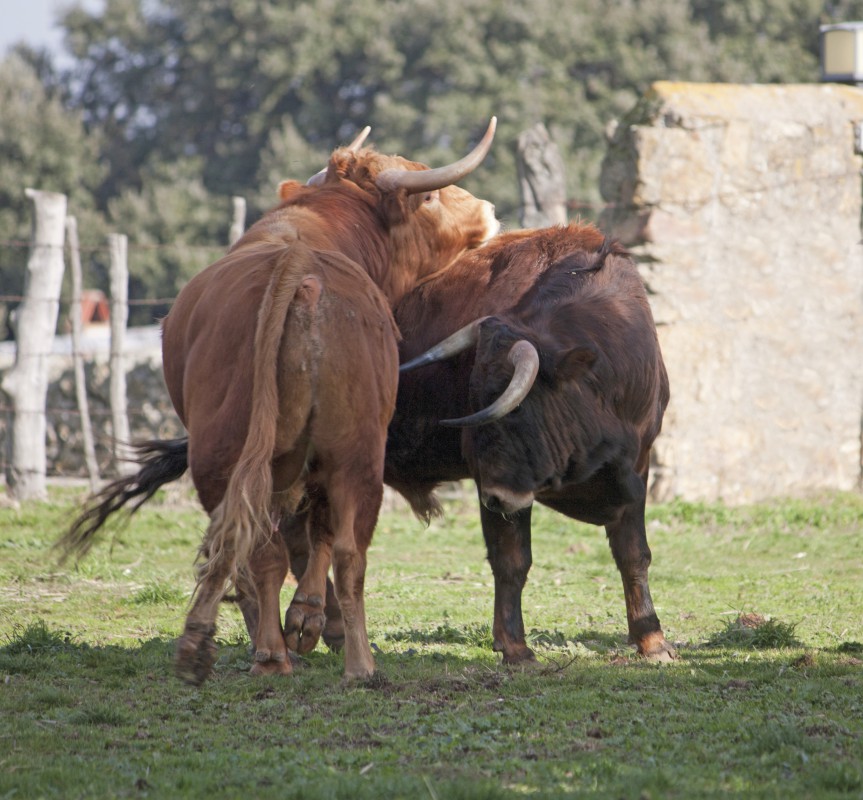 El cielo hoy es azul purísima como los vestidos de Chenel, sin atisbos de nubes tras una quincena de mucho agua y solo el tableteo pausado de un helicóptero interrumpe la paz campera. Nada que extrañe a las vacas, acostumbradas al paso del artilugio volador que -nos cuentan- va camino de la base de Colmenar. Zacarías, mientras recorremos los cercados de las vacas cuenta detalles de esta y de aquella otra con un tono pausado, sin atisbo de presunción y una ayuda documental infalible, la de Carlos Zúñiga, que este año ha estrenado estatus de empresario jet set y sale al quite, pone la fecha, el nombre, el número y la reata de sementales y vacas con una precisión exultante. Lo suyo en el campo ganadero es digno de estudio, es como si llevase en el coco un disco duro de no sé cuántos megas, muchos. Artesano, Mamarracho, Pescadero -“sí, el indultado en Albacete”- son nombres de sementales que están o estuvieron en la casa y que te recita de memoria con multitud de detalles del orden de “Sí, ese lo tuvo el padre de Juli en su finca de Tudela…” y Zacarías asiente y si en algún momento no salta al quite con la presteza necesaria Zacarías le reclama “¿Verdad, Carlos? ¿Carlos, te acuerdas de…?” y eso que sucede hoy aquí en el Quejigal, doy fe de que pasa igual en muchas, muchas otras ganaderías donde hemos coincidido.