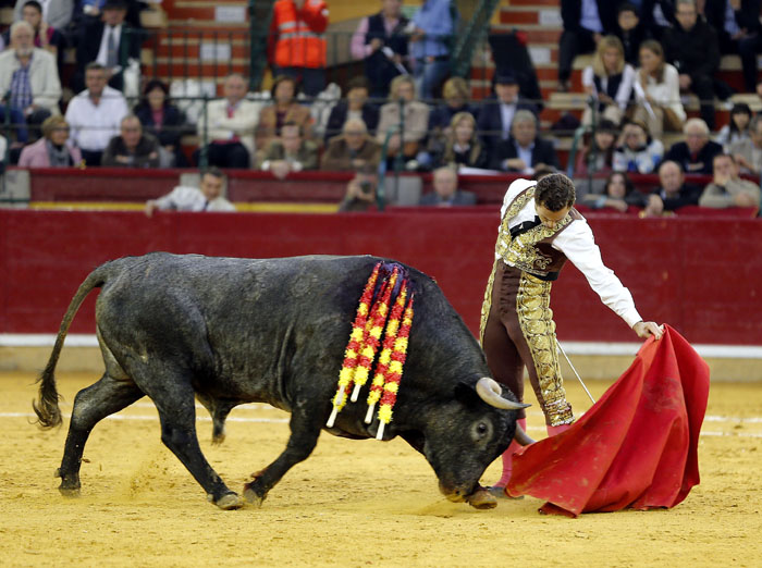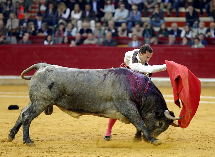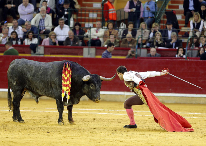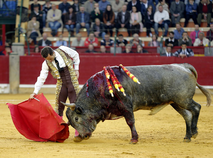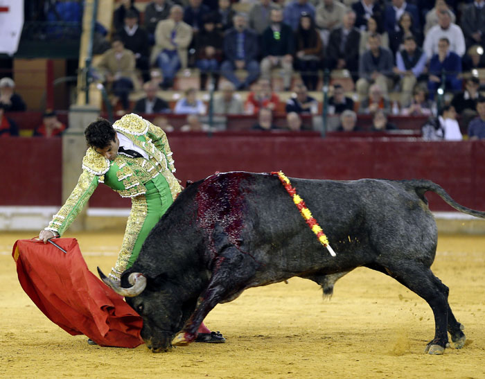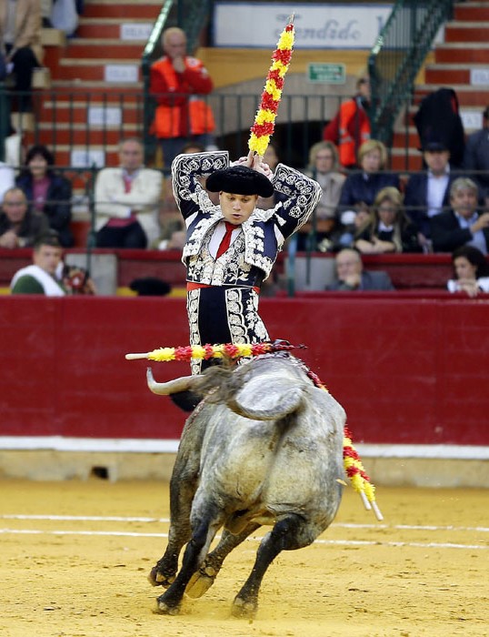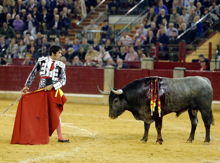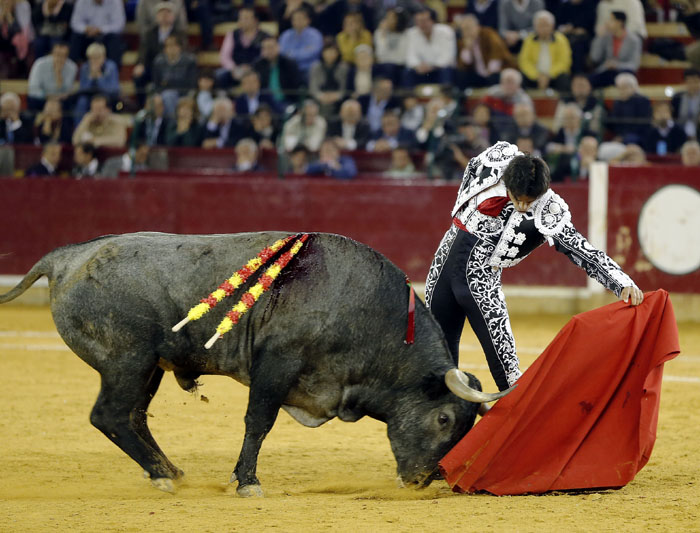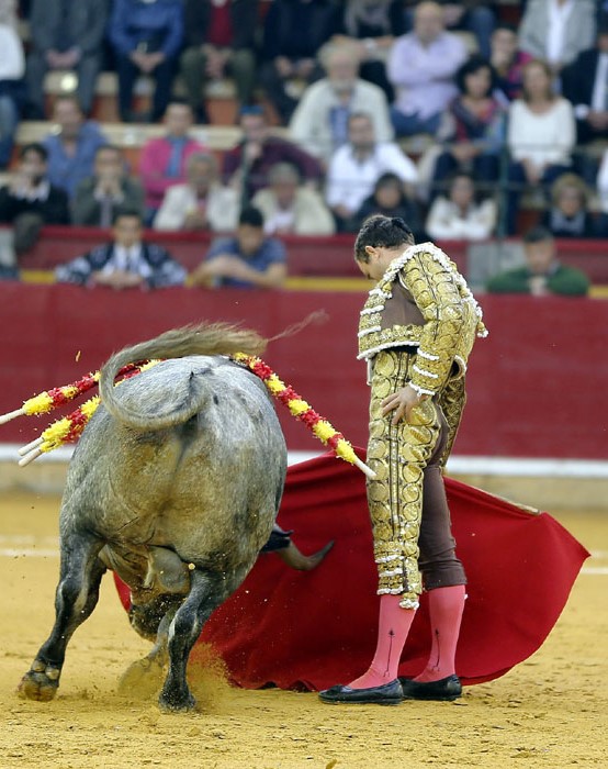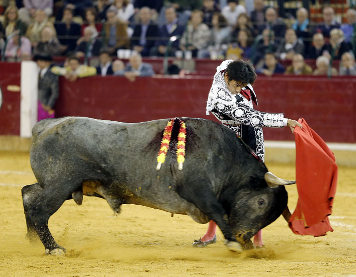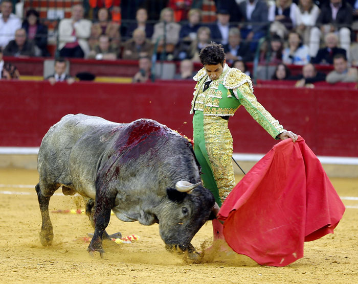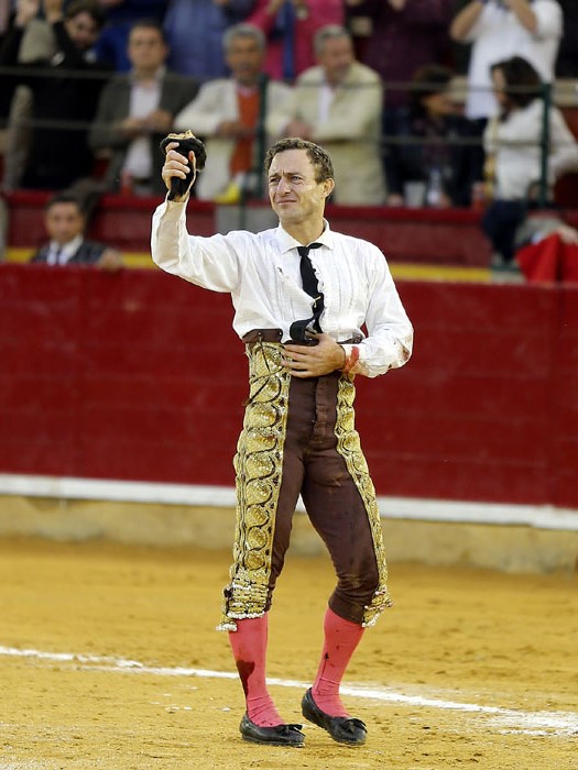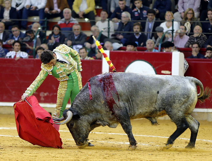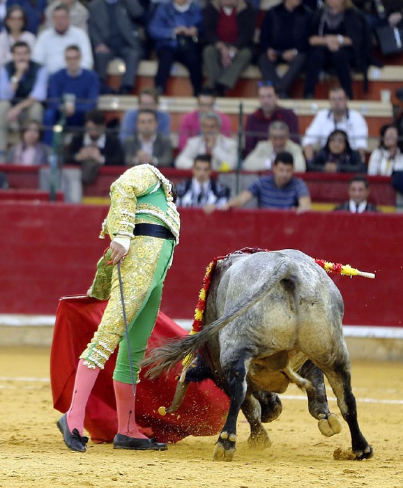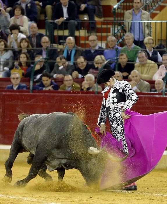 El murciano, tras pasar por la enfermería, salió a torear al cuarto con una fractura de costilla. De rodillas recibió de nuevo a su oponente para enjaretarle un saludo con templadas verónicas y delantales y una buena media de remate. El de Adolfo Martín fue un auténtica alimaña. Lo lidió sobre las piernas el murciano y fue un milagro los muletazos que le robó sobre la mano izquierda. Milagroso fue también que no le hiriera el toro tras una fortísima y dura voltereta de la que se libró de milagro. Tremenda la paliza. Se jugó la vida sin trampa ni cartón. Vergüenza torera de Rafaelillo. Sinceridad y verdad del murciano. Evidentes los signos de dolor. Dejó media estocada y el palco premió su esfuerzo con una oreja que paseó entre las lágrimas y con el respeto del público.
